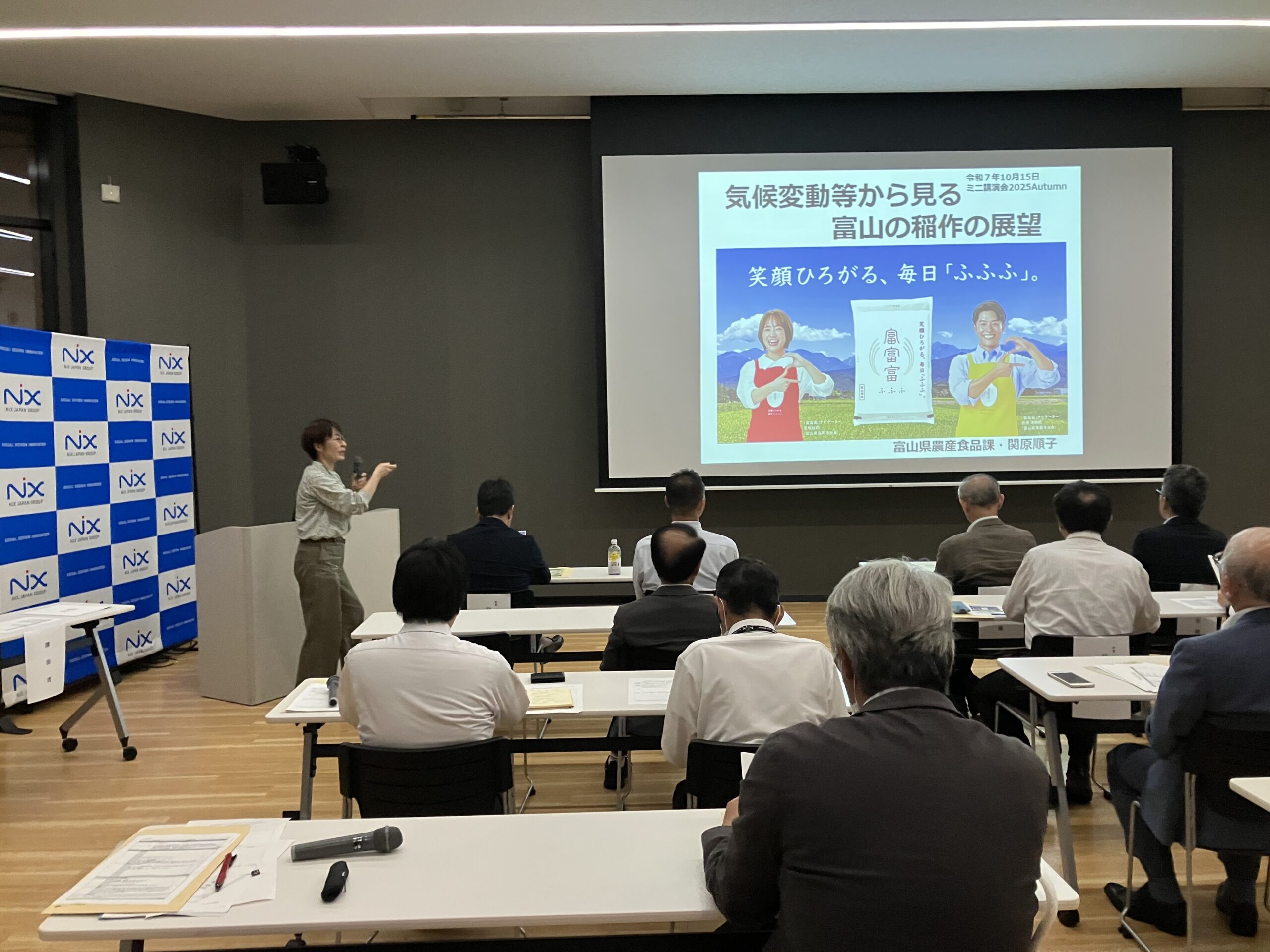 2025年10月15日(水)にNiXビル1階ホールにて,ミニ講演会2025Autumnを開催しました。 「 気候変動等から見る富山の稲作の展望」 富山県農林水産部農産食品課 関原 順子 氏 (技術士(農業部門)) 多数のご参加、ありがとうございました。 |
